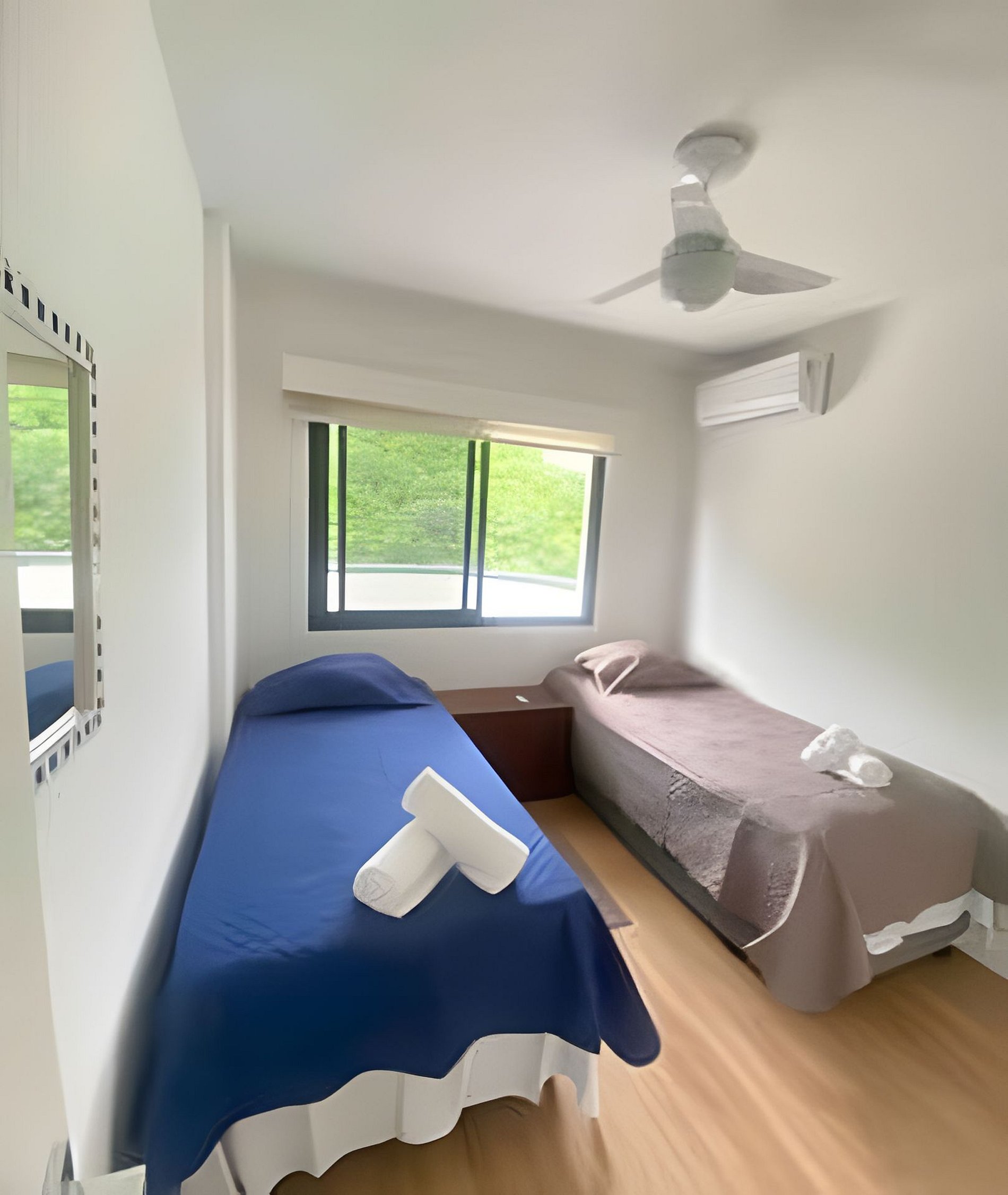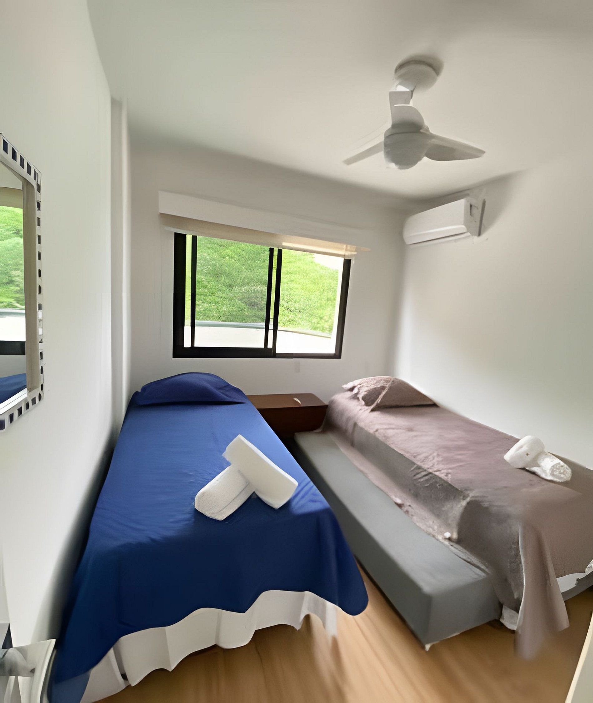 1 suite completa com banheiro ar condicionado e ventilador de teto, black out e janela com vista para a montanha e outro quarto com bi-cama, ar condicionado e ventilador de teto com armário e black out, janela com vista para montanha. Banheiro completo no corredor. Sala com sofá confortável, smart tv e wifi, mesa para comer. Cozinha com geladeira, microondas, fogão. Lavanderia com tanque e lava e seca roupas. Varanda com vista para o mar e montanhas.